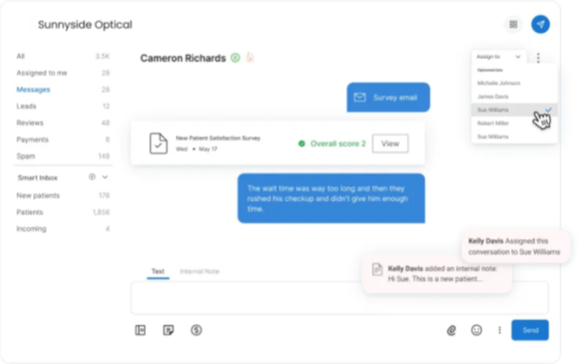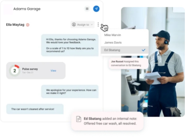 Read responses, reply to customers, resolve complaints, and request referrals — all from one unified inbox.