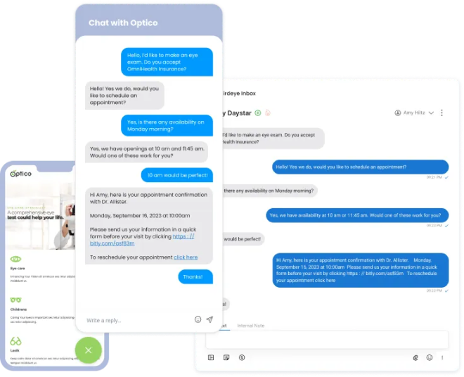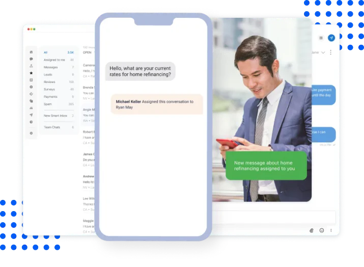 Each chat automatically starts with a name and number so you can focus on closing the deal instead of fishing for contact details. Chat in real-time with visitors and conduct virtual consults. Share prices and product pictures to move prospects down the sales funnel faster. Text visitors 1:1 after they leave your website and integrate with Salesforce to effectively manage those leads.